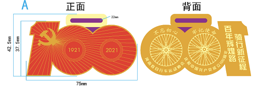 本次活动还设计了纪念建党100周年的完赛奖牌,河南省自行车运动协会副会长唐超英介绍到,本次活动奖牌正面是中共中央宣传部发布的官方100周年庆祝活动标识,活动标识由党徽、数字“100”“1921”“2021”和光芒线组成,生动展现中国共产党团结带领中国人民不忘初心、牢记使命、艰苦奋斗的百年光辉历程。反面则是采用自行车车轮的元素,车轮的辐条和正面的光芒线相互呼应,寓意历史车轮滚滚向前,时代潮流浩浩荡荡,代表了每一个共产党人牢记使命,不忘初心的本色,表达了百年奋斗辉煌路,而今踏上新征程的时代赞歌。奖牌通过正面和背面的结合,把此次活动所展现的时代寓意表达的淋漓尽致,也彰显了我省体育工作者献礼中国共产党百年华诞的诚心诚意,也希望通过此次活动,让更多的人了解党的历史,让更多的人参与体育运动、体育锻炼中。